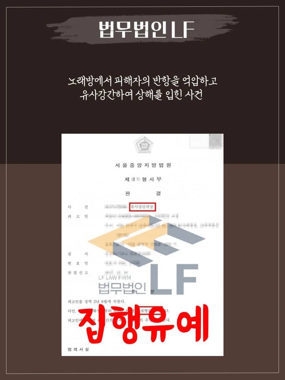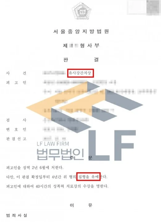 그래서 변호인은 피해자의 피해 복구를 위하여 사죄의 마음을 거듭 전달하였고, 원만한 합의 절차를 진행하였습니다. 또한 정상 자료를 바탕으로 변호인 의견서를 작성하여 법원에 제출하며 최대한의 선처를 구해 유사강간치상죄에 대해 집행유예를 받을 수 있게 되었습니다.