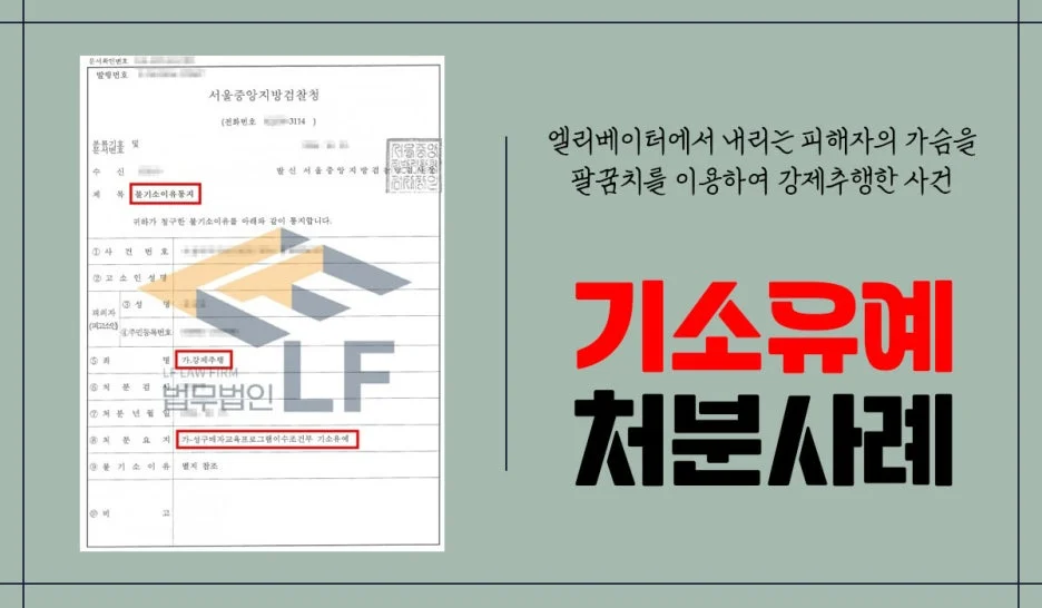 의뢰인은 상가 1층에서 엘리베이터를 기다리다가 문이 열리면서 피해자가 보이자, 그 즉시 오른쪽에 서 있다 왼편으로 이동하여 엘리베이터 밖으로 걸어 나오는 피해자의 오른쪽 가슴을 자신의 오른쪽 팔꿈치를 이용하여 쓸고 지나가는 방법으로 강제추행하여 수사기관의 조사를 받게 되었습니다.