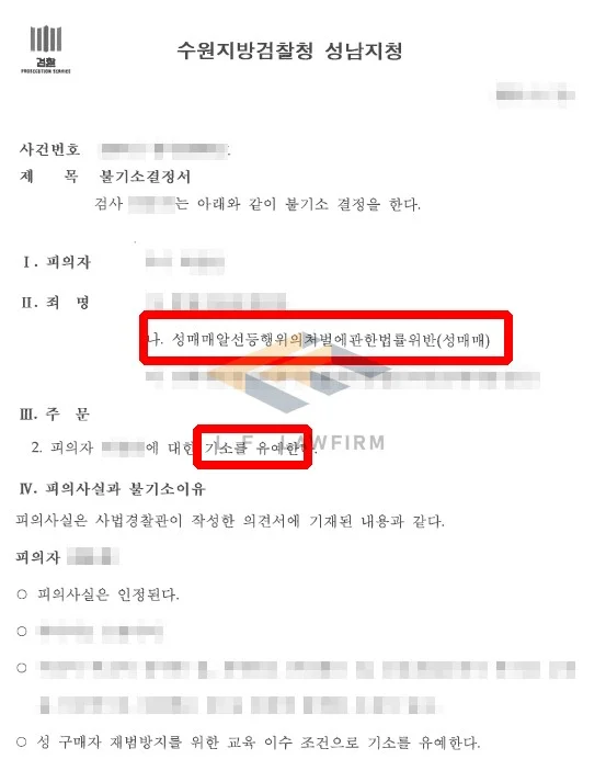 그래서 변호인은 의뢰인의 정상 관계 자료들을 잘 수집한 뒤 변호인 의견서를 작성하여 수사기관에 제출하였고, 의뢰인의 재범을 막기 위한 노력을 전달하며 최대한의 선처를 해줄 것을 요청하여 성매매 위반 혐의에 대해 기소유예를 받을 수 있게 되었습니다.