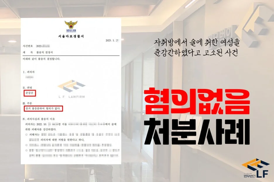 그래서 변호인은 의뢰인과 사건 당시의 상황에 대해 매우 상세히 이야기를 나눈 뒤 고소인이 제출한 고소장을 열람하였고, 이후 사건 당시의 상황을 재구성해 본 뒤 수사기관의 조사에 동석을 하였으며, 의뢰인을 위한 변호인 의견서를 제출한 뒤 객관적인 증거인 CCTV 등을 확보하여 이를 토대로 사건 당시 피해자가 만취한 상태가 아니었음을 강력히 주장하여 혐의없음을 받을 수 있게 되었습니다.