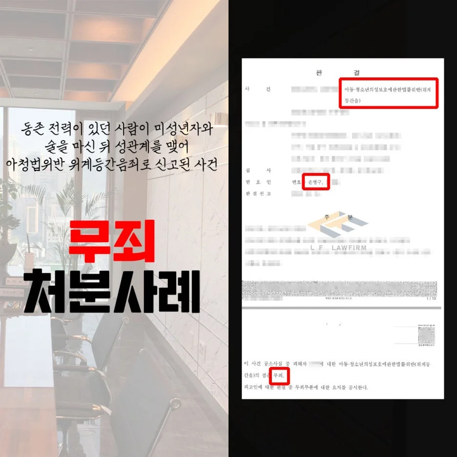 의뢰인은 동종 전과가 있던 사람으로서 미성년자인 피해자와 자신의 집에서 술을 마신 뒤 성관계를 가지게 되었는데, 이후 피해자가 강간을 당했다며 신고를 하였고, 이에 의뢰인은 아청법위반 위계등간음죄로 수사기관의 조사를 받은 뒤 기소되어 재판을 받게 되었습니다.