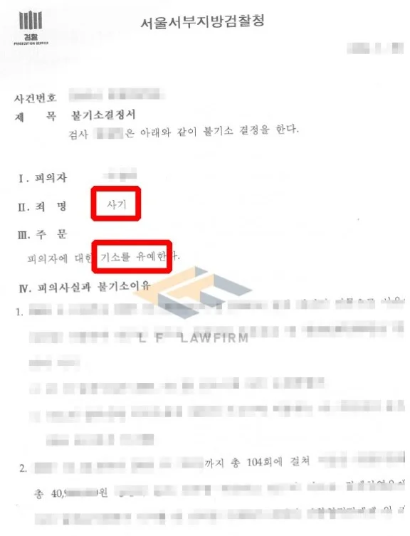 그래서 변호인 조력단은 피해자와 합의를 대행하였으며, 의뢰인의 정상 관계 자료 등을 받아 변호인 의견서를 수사기관에 제출하며 선처를 구하는 등 조력 활동을 하였습니다. 그렇게 하여 사기 혐의에 대해 기소유예를 받을 수 있게 되었습니다.