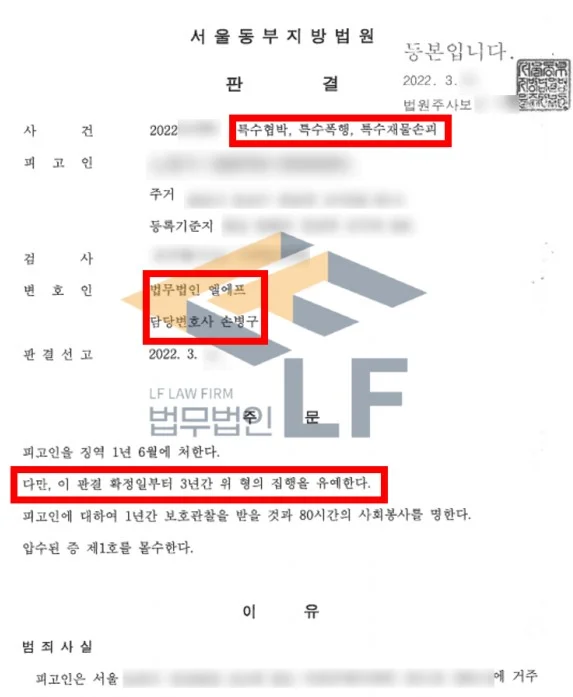 의뢰인은 자신의 범행 사실을 모두 자백하였으나 위험한 물건을 이용하여 범행을 저지른 중한 사안이며, 피해자의 정신적 충격이 상당하여 엄벌이 예상되는 상황이었습니다. 그래서 변호인은 의뢰인과 면담을 통해 파악한 사건 내용을 바탕으로 원만한 해결을 위해 필요한 정상 자료 목록을 안내하였고, 재판의 모든 절차와 피해자의 피해 회복 및 합의 절차를 조력함과 동시에 변론요지서를 작성하여 제출하는 조력 활동을 하였습니다. 그렇게 하여 이 사건에 대해 집행유예 판결을 이끌게 내었습니다.