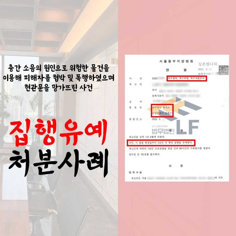 층간 소음의 원인으로 위험한 물건을 이용해 피해자를 협박 및 폭행하였으며 현관문을 망가뜨린 사건