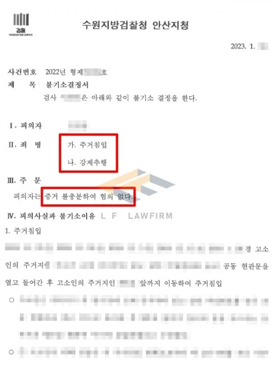 의뢰인은 피해자와 사귀다가 헤어지게 되었는데, 헤어진 뒤 약 1~2년이 지난 시점에서 갑자기 피해자로부터 주거침입과 강제추행으로 고소를 당하게 되었고, 이에 강제추행과 주거침입 혐의로 수사기관의 조사를 받게 되었습니다.