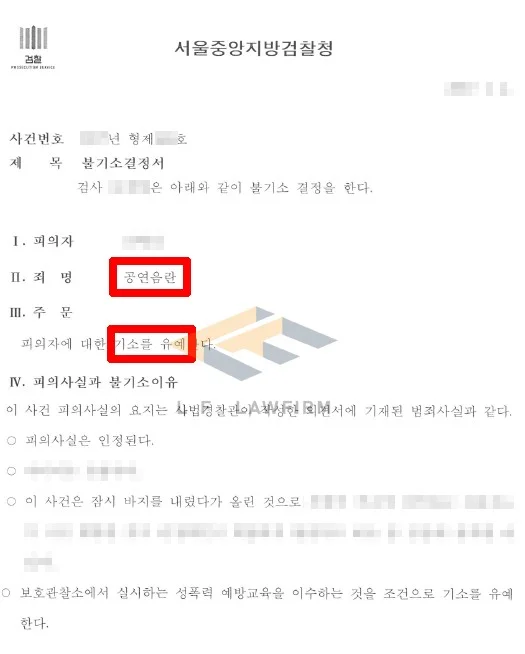 그래서 의뢰인의 변호인으로서 범죄를 목격한 피해자에게 의뢰인이 사죄하고 있는 마음을 전달하여 합의를 하였고, 이에 더해 의뢰인의 정상 관계 자료들을 잘 수집한 뒤 변호인 의견서를 작성하여 수사기관에 제출하면서, 선처를 위해서 적극 조력 활동을 하여 기소유예를 받을 수 있게 되었습니다.