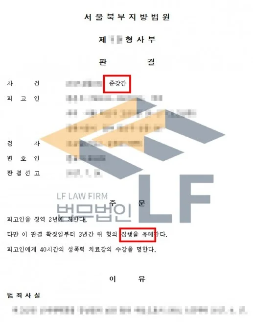 원만한 합의를 통해 처벌불원서를 재판부에 제출하였으며, 의뢰인이 잘못을 깊이 뉘우치고 반성하고 있음을 변론하며 선처를 구하였습니다. 또한 의뢰인의 양형 자료를 바탕으로 변호인 의견서를 작성하여 제출하는 변호 활동을 하였습니다. 그렇게 하여 해당 사안에 대해 집행유예를 받을 수 있게 되었습니다.