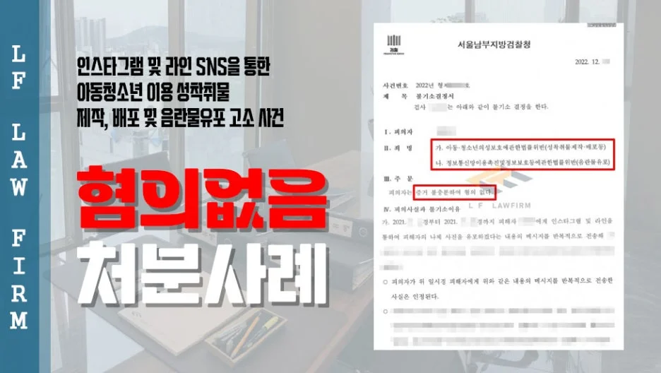 의뢰인은 인스타그램 및 라인과 같은 SNS를 이용하여 아동청소년 등을 대상으로 성착취물을 제작하고 음란한 영상 등을 인터넷에 유포하였다는 사실로 고소를 당하였고, 이에 성착취물 제작 및 배포와 음란물 유포 혐의에 수사기관의 조사를 받게 되었습니다.