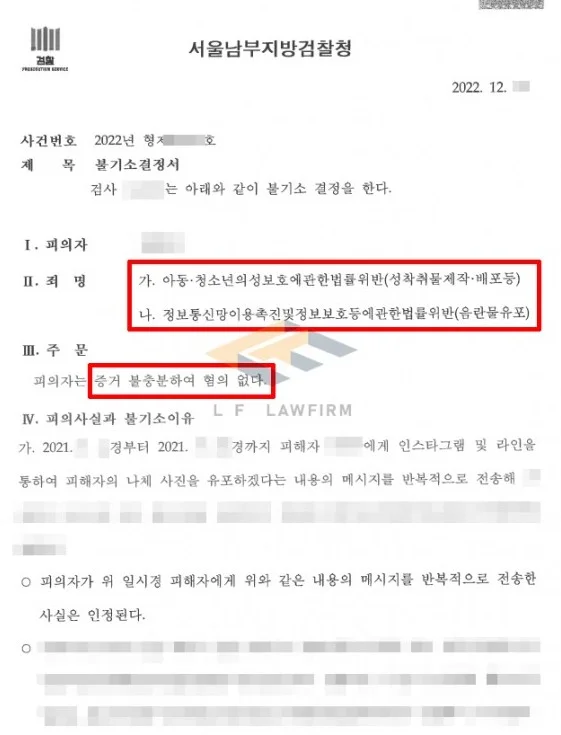 그래서 변호인은 의뢰인과 면밀한 장시간 면담을 거친 뒤 고소인과 나눈 대화 내역 등을 기초로 법리적인 검토를 하였고, 이에 법리적 의견을 담은 변호인 의견서를 수사기관에 제출하였으며, 의뢰인의 수사기관의 조사에도 동석하여 의뢰인이 편안한 분위기 속에서 잘 진술할 수 있도록 조력하였고, 추가적으로 만 19세 미만의 미성년자에 대한 인식이 없었음을 변호하였습니다. 그렇게 하여 본 사안에 대하여 혐의없음을 받을 수 있게 되었습니다.