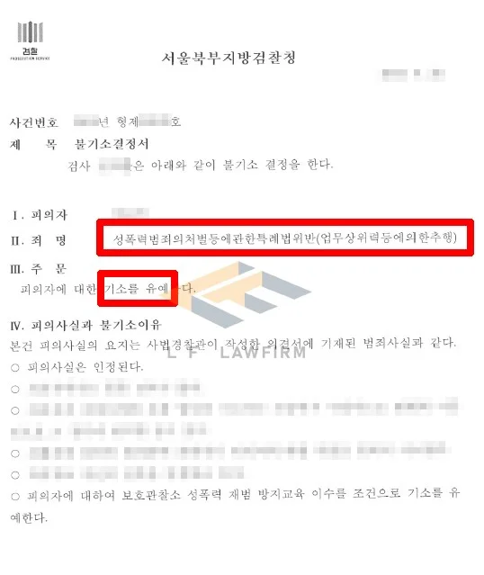 그래서 변호인은 피해자에게 의뢰인이 사과하는 마음을 잘 전달하여 피해자와 원만히 합의하였고, 이에 더해 의뢰인의 양형 자료를 잘 수집한 뒤 변호인 의견서를 작성하여 수사기관에 제출하면서 선처를 위해서 적극 변호 활동을 하였습니다. 그렇게 하여 사내성추행 사건에 대하여 기소유예 선처를 받을 수 있게 되었습니다.
