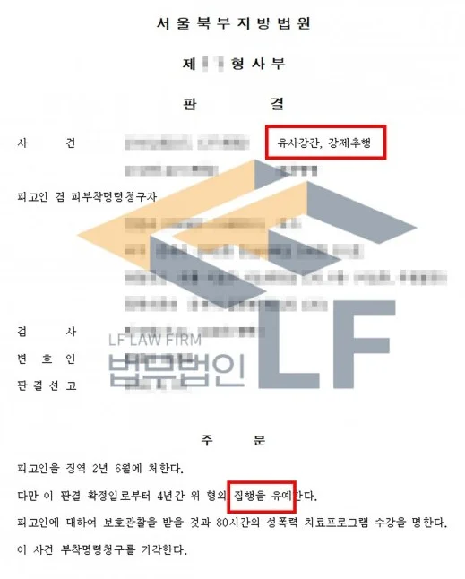 또한 의뢰인이 각 범행을 인정하고 깊이 반성하고 있음을 변론하며 선처를 구하였고, 의뢰인의 양형 자료를 바탕으로 변호인 의견서를 작성하여 재판부에 제출하였습니다. 그렇게 하여 유사강간에 대해서 집행유예를 받게 되었습니다.