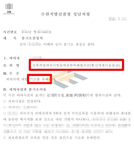 그래서 변호인은 피해자를 잘 설득하여 합의를 하였고 이에 더하여 의뢰인의 정상관계 자료를 받아 변호인 의견서를 수사기관에 제출하며 최대한 선처를 구하는 등 적극적인 변호활동을 하여 그 결과 본 사안에 대해 기소유예를 받을 수 있게 되었습니다.