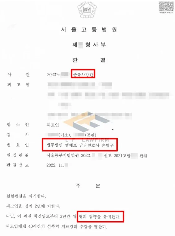 이후 의뢰인과 협의하여 혐의를 인정하되 피해자와 합의 후 집행유예 판결을 받는 방향으로 전략을 세웠습니다. 변호인으로서 피해자 측에 연락하여 피해자 측과 라포를 형성한 뒤 원만한 합의를 이끌어 내었으며, 합의서 및 처벌불원서를 법원에 제출하며 선처를 위한 변론을 하여 준유사강간에 대해 집행유예를 받을 수 있게 되었습니다.