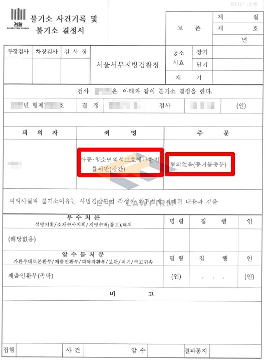 그래서 변호인은 이 사건 당시의 정황과 상황을 매우 상세히 담은 변호인 의견서를 작성하여 수사기관에 제출하였고, 이에 더하여 수사기관에 피해자의 진술에 신빙성이 없음을 적극 주장하였습니다. 그렇게 하여 아청법강간죄 사안에 대해 혐의없음을 받을 수 있게 되었습니다.