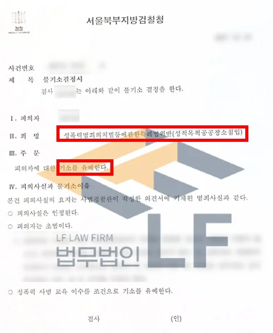 그래서 변호인은 의뢰인의 원만한 사건 해결을 위한 정상 자료 목록을 안내하였으며, 담당 수사관과 담당 검사와 면담하여 최대한의 선처를 요청하였습니다. 또한 정상 자료들을 통해 변호인 의견서를 작성하여 수사기관에 제출하는 조력활동을 하였습니다. 그렇게 하여 의뢰인이 여자 화장실에 침입한 문제에 대하여 기소유예를 받을 수 있게 되었습니다.