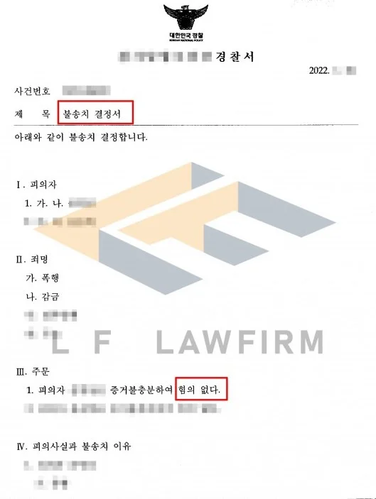 그리고 경찰 조사 전 충분한 시간을 가지고 조사를 준비했고 조사가 끝난 후에는 담당 수사관과의 면담을 하고 이후 변호인 의견서를 제출하며 상대방 진술의 신빙성에 대해 다투어 폭행죄 고서 사안에 대해 불송치 결정 혐의없음을 받을 수 있게 되었습니다.