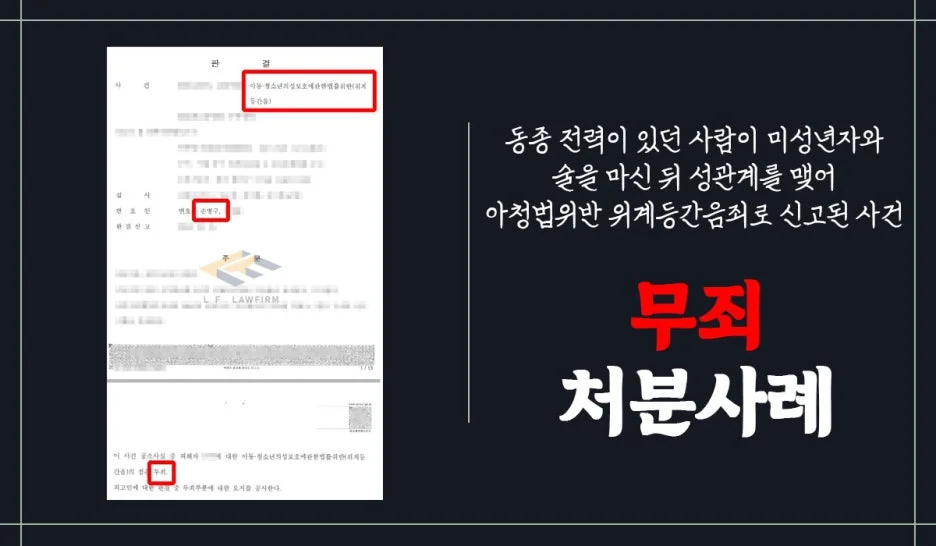의뢰인은 동종 전과가 있던 사람으로서 미성년자인 피해자와 자신의 집에서 술을 마신 뒤 성관계를 가지게 되었는데, 성관계 이후 피해자가 강간을 당했다며 신고를 하였고, 아청법 위반 위계등간음죄로 수사기관의 조사를 받은 뒤 기소되어 재판을 받게 되었습니다.