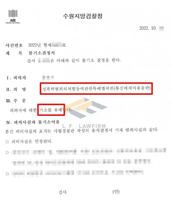이에 더하여 사건을 형사조정으로 회부해 달라고 요청해, 형사조정에서 피해자와 원만한 합의 및 처벌불원의사를 이끌어내었습니다. 이후 검사 면담을 통해 선처를 위한 적극 변호를 하였습니다. 그렇게 하여 카톡으로 보낸 성희롱 발언의 통매음 사건에 대해 기소유예를 받을 수 있게 되었습니다.