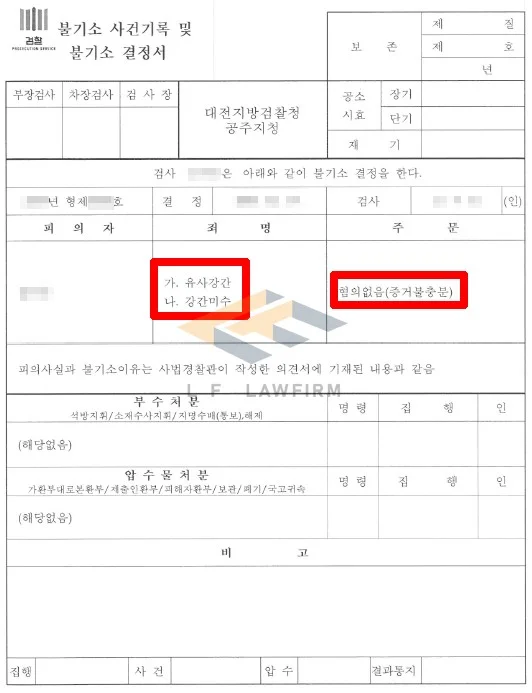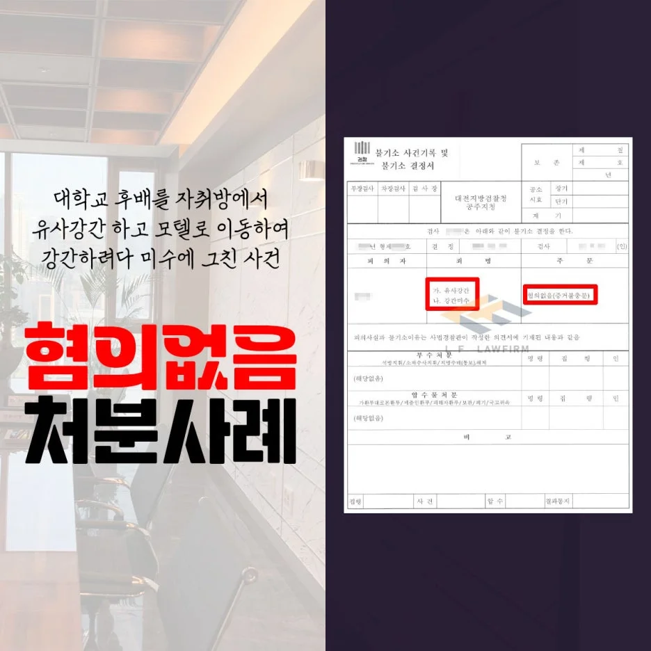 그래서 변호인으로서 이 사건 당시의 상황을 매우 상세히 담은 변호인 의견서를 작성하여 수사기관에 제출하였고, 이에 더하여 수사기관에 피해자 진술에 신빙성이 없음을 변론하여 선처를 받을 수 있도록 적극 조력하여 혐의없음 처분을 받는 것으로 유사강간죄 사안을 마무리할 수 있게 되었습니다.
