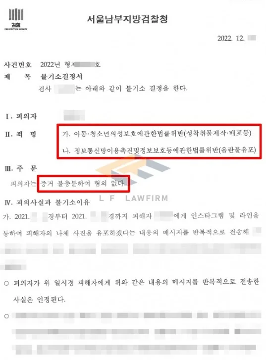 그래서 변호인은 의뢰인과 장시간 면담을 거친 뒤 고소인과 나눈 대화 내역 등을 기초로 법리적인 검토를 하였고, 이에 법리적 의견을 담은 변호인 의견서를 수사기관에 제출하였으며, 수사기관에도 동석하여 의뢰인이 편안한 분위기 속에서 잘 진술할 수 있도록 조력하였고, 추가적으로 19세 미만의 미성년자에 대한 인식이 없었음을 변호하여 혐의없음 처분을 받을 수 있게 되었습니다.