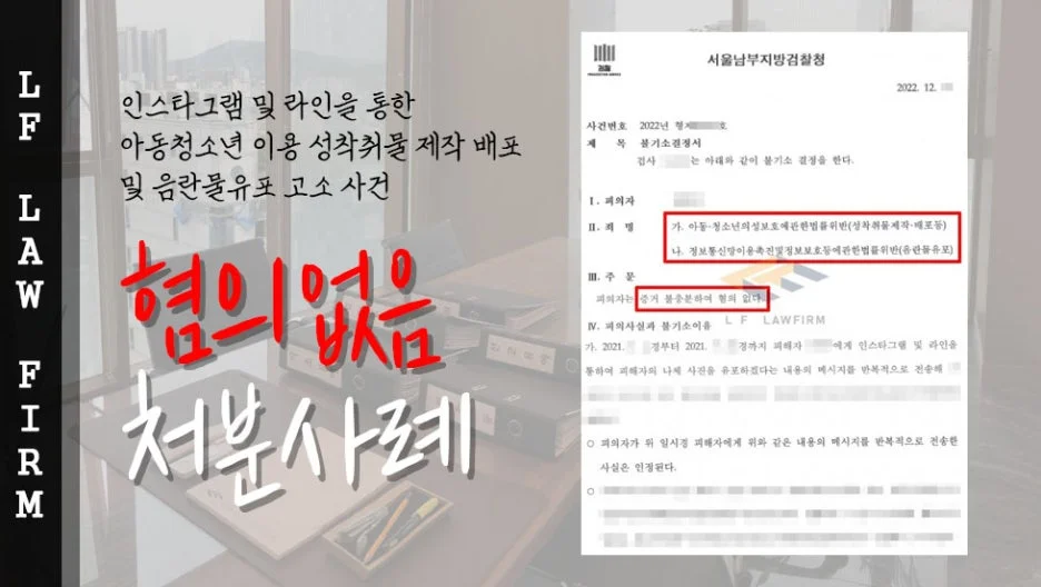 의뢰인은 인스타그램과 라인과 같은 SNS를 이용하여 아동청소년을 대상으로 성착취물을 만들고 영상을 인터넷에 유포하였다는 사실로 고소를 당하게 되었고, 이에 아동청소년의 성 보호에 관한 법률 위반 성착취물제작배포죄와 정보통신망 이용 촉진 및 정보보호 등에 관한 법률 위반 음란물유포죄로 수사기관의 조사를 받게 되었습니다.