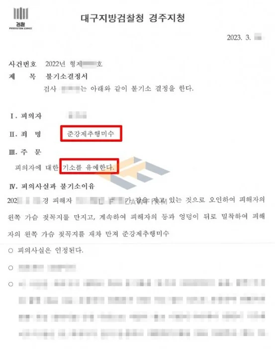 그리고 의뢰인에게 유리한 양형 자료들을 수집하여 변호인 의견서를 제출하고, 수사기관의 조사에도 동석하여 편안한 분위기 속에서 잘 진술할 수 있도록 조력하였으며, 합의를 완강히 거부하는 피해자와 라포를 형성하여 합의 및 처벌불원의사를 이끌어 내어 이를 수사기관에 제출하는 등 조력활동을 하였습니다. 그렇게 하여 준강제추행 미수 혐의에 대하여 기소유예를 받게 되었습니다.