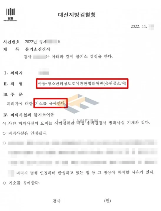 그래서 변호인으로서 의뢰인이 왜 이 사건 성착취물을 내려받게 되었는지를 파악하게 되었고, 이후 의뢰인에게 필요한 양형 자료들을 수집한 뒤 선처를 바라는 변호인 의견서를 작성하여 수사기관에 제출하였습니다. 그리고 조사에도 동석하여 의뢰인이 자유로운 분위기 속에서 잘 이야기할 수 있게 조력하였으며, 수사관 면담 등을 통해 선처를 변호하여 기소유예를 받을 수 있도록 하였습니다.