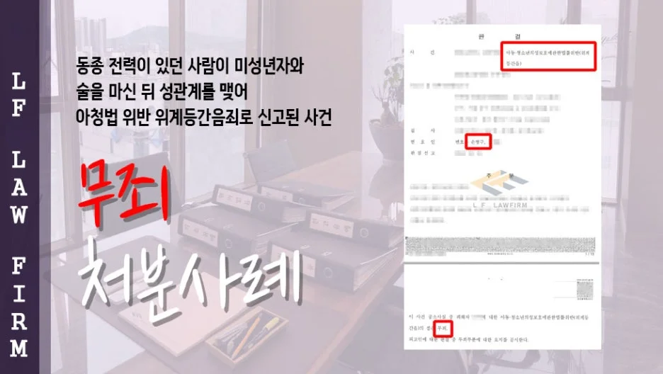 의뢰인은 동종 전과가 있던 사람으로서 미성년자인 피해자와 자신의 집에서 술을 마신 뒤 성관계를 가지게 되었는데, 이후 피해자가 강간을 당했다며 고소를 하였고 이에 아청법 위반 위계등간음죄로 수사기관의 조사를 받은 뒤 기소되어 재판을 받게 되었습니다.