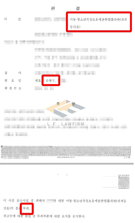 이 사건에 있어 동종 전과가 있었기에 수사기관은 의뢰인의 말을 믿어주지 않았고, 이에 변호인은 위계등간음죄를 다투기 위해 의뢰인에게 유리한 증거를 수집하였고, 당시 사실 관계를 잘 담은 변호인 의견서를 작성하여 제출하였으며, 피해자 진술에 신빙성이 없음을 밝히기 위해 법정에 증인으로 불러 증인 신문을 하는 등의 변론을 하여 무죄를 이끌 수 있게 되었습니다.