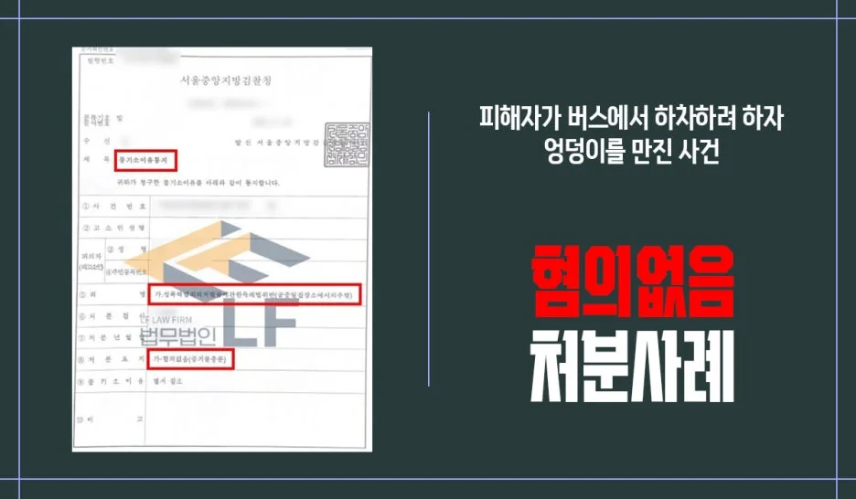 그래서 변호인은 의뢰인의 억울함을 파악한 뒤 버스 CCTV를 확인하여 추행을 한 적이 없으며 오히려 피해자와 접촉하지 않기 위해 몸을 비틀고 있음을 강력히 주장한 변호인 의견서를 작성하여 제출하였습니다. 또한 조사에 입회하여 담당 수사관과의 면담을 통해 피해자가 자리를 빠져나가며 손이 닿았을 수는 있지만, 가방을 붙잡고 있었으며 추행의 의도가 전혀 없었음을 강력히 주장하여 혐의없음을 받을 수 있도록 하였습니다.