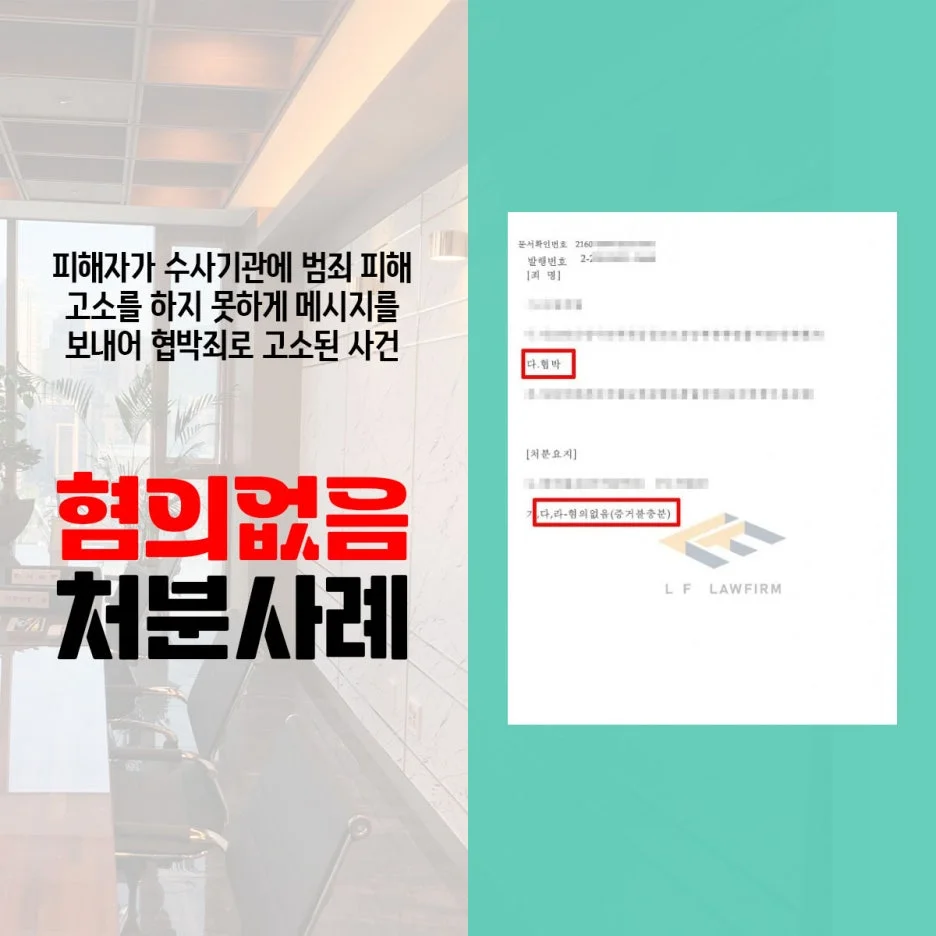 그래서 변호인은 이 사건 당시 발생하였던 사실 관계를 면밀히 살펴 의뢰인이 보낸 메시지가 협박을 할 목적으로 전달한 내용이 아님을 기재한 변호인 의견서를 작성하여 수사기관에 제출하였고 이에 더하여 수사기관의 조사에 동석하여 의뢰인이 자신의 입장을 잘 설명할 수 있도록 조력하여 협박죄 고소에 대하여 혐의없음 처분을 받을 수 있도록 하였습니다.