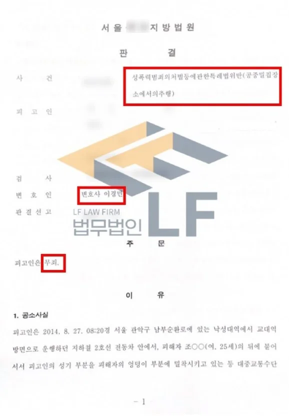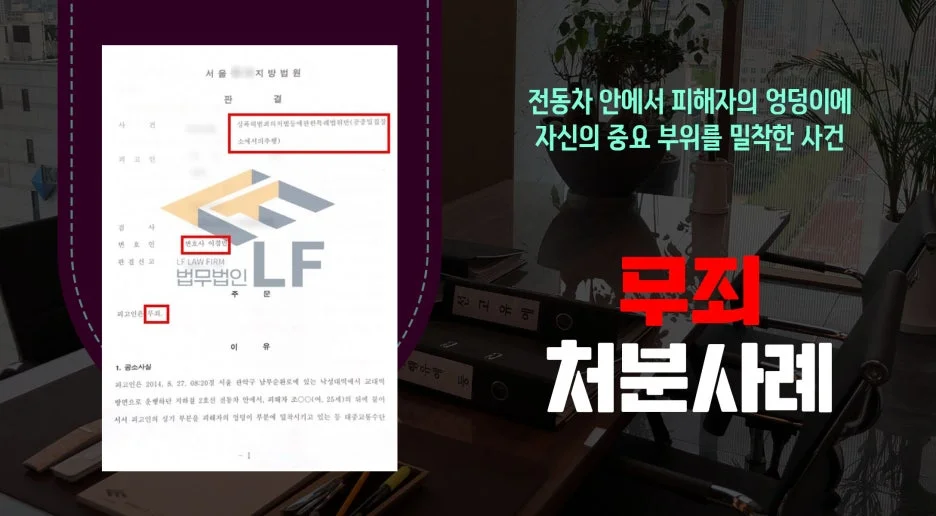의뢰인의 억울한 상황을 파악한 변호인은 조사 전 예상 질문을 정리해 보며 준비를 진행하였습니다. 또한 조사에 동행하여 피해자의 진술을 파악하였고, 담당 검사와의 면담을 통해 사건 당시 탑승한 지하철에 사람이 가득했으며, 이로 인해 몸이 움직일 수 없는 상황이었다는 점, CCTV에서 보았을 때 추행을 할 의도가 없었음을 주장하였습니다. 그렇게 하여 공중밀집장소추행 혐의에 대하여 무죄 판결을 받을 수 있게 되었습니다.