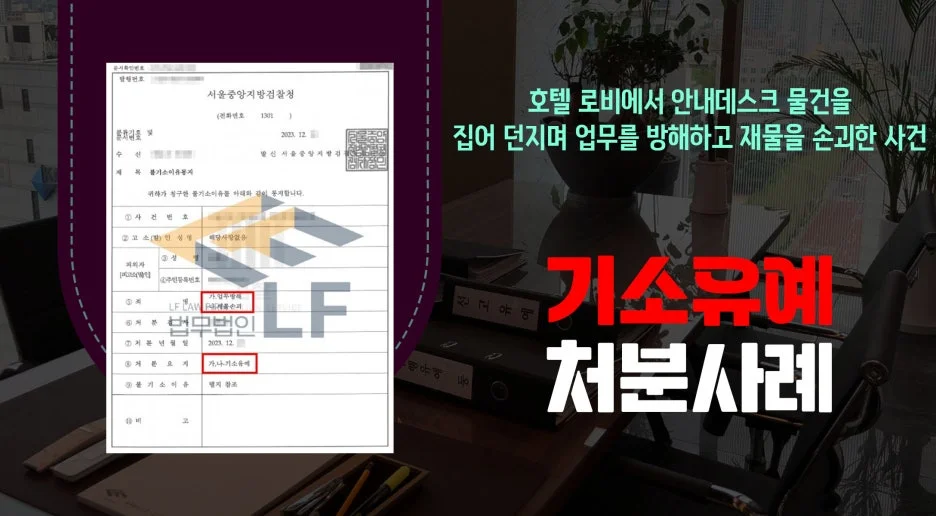 의뢰인은 호텔에서 투숙하기 위해 호텔 건물 로비로 들어가 호텔 직원인 피해자가 말을 걸자 갑자기 안내 데스크에 있는 컴퓨터를 바닥에 던지려고 하고 필통을 집어던지는 등 10분간 위력으로 업무를 방해하였으며, 이 과정에서 명패를 바닥에 던져 파손하여 손괴 혐의로 조사를 받게 되었습니다.