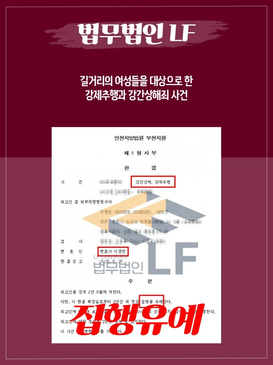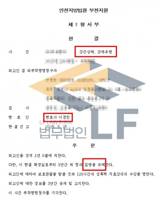 그래서 변호인은 피해자의 피해 회복을 위하여 2명과 합의하여 법원에 처벌불원서를 제출하였고, 의뢰인이 범행을 모두 인정하며 깊이 반성하고 있으며, 가정의 생계를 책임져야 하는 점을 변론하여 선처를 구하였습니다. 그리고 의뢰인에게 필요한 양형 자료를 안내하고 수집에 조력을 드렸습니다. 그렇게 하여 강간상해죄와 강제추행 사안에 대하여 집행유예를 받을 수 있게 되었습니다.