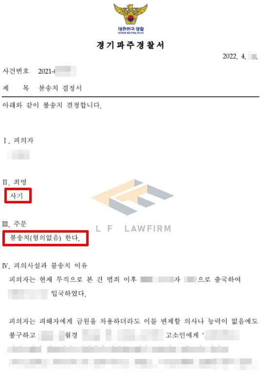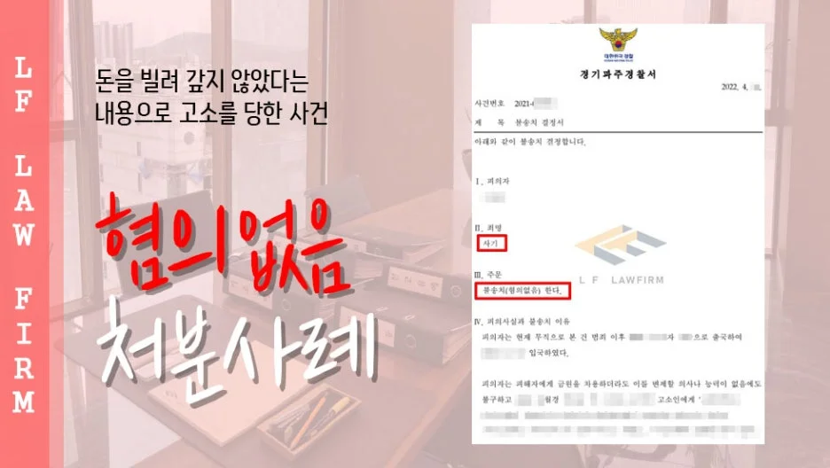의뢰인의 수사기관에도 모두 동석하여 의뢰인이 자유로운 분위기 속에서 진술을 할 수 있도록 조력하였으며, 억울한 사정을 변호인 의견서를 통해 주장하였습니다. 그렇게 하여 사기죄 사건에 대하여 혐의없음을 받을 수 있게 되었습니다.