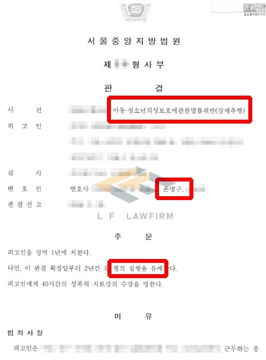 그래서 변호인은 피해자와의 원만한 합의를 끌어냈고, 이에 더하여 의뢰인의 정상 관계 자료를 받아 변호인 의견서를 법원에 제출하며 최대한 선처를 구하였습니다. 그리고 의뢰인이 불구속 상태에서 죄를 뉘우칠 수 있도록 하여 줄 것을 변론하는 적극적인 조력을 하였습니다. 그렇게 하여 미성년자 대상 성범죄 아청법 위반 혐의에 대하여 집행유예를 받을 수 있게 되었습니다.