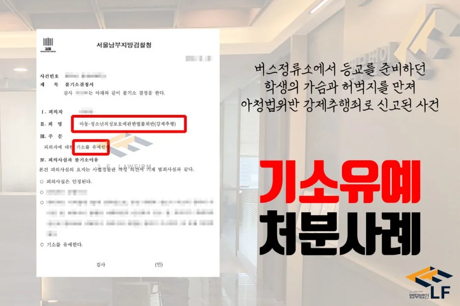의뢰인은 버스정류소에서 등교를 위해 버스를 기다리고 있던 미성년자인 학생의 가슴과 허벅지를 손으로 만져 강제추행하였다는 사실로 신고를 당하였고, 이에 아청법위반 강제추행 혐의로 수사기관의 조사를 받게 되었습니다.