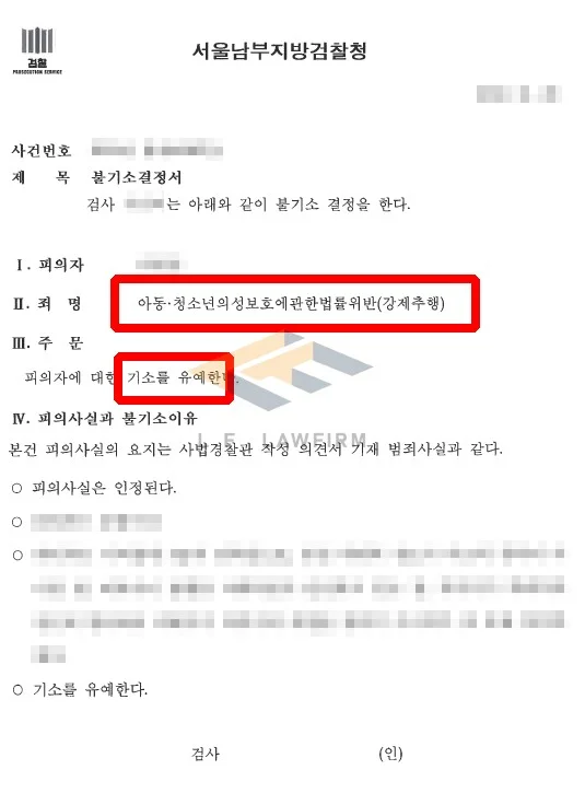 그래서 변호인은 피해자에게 의뢰인이 사죄하는 마음을 잘 전달하여 원만히 합의를 할 수 있게 하였고, 이에 대해 의뢰인이 정상관계 자료들을 잘 수집한 뒤 변호인의견서를 작성하여 수사기관에 제출하면서, 의뢰인의 선처를 위해 변론을 하였습니다. 그렇게 하여 아청법위반 혐의에 대하여 기소유예를 받을 수 있게 되었습니다.